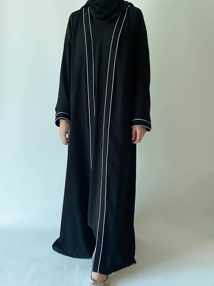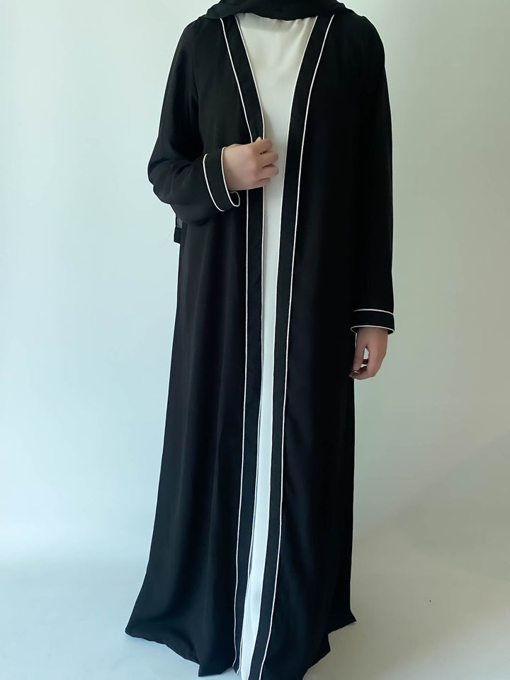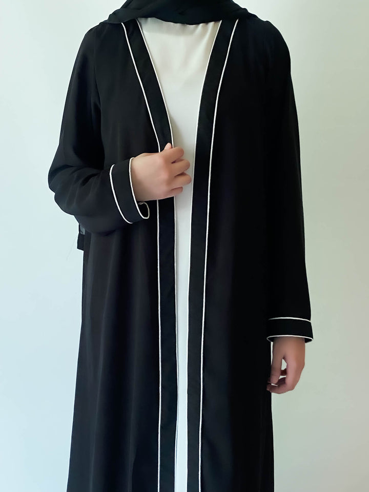A solid black kimono with white piping. This includes kimono only, easy to throw over any outfit. Black inner co-ord can be purchased separately.